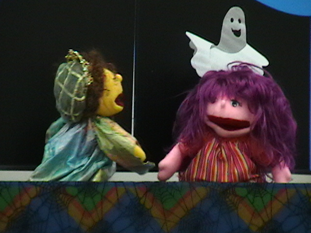 Here is a picture of Daisy in action during a presentation of "The Princess and the Pumpkin", a Halloween version of the Princess and the Pea. Both Daisy and the Queen were made using the Child Pattern. Daisy is a little larger than the rest of my puppets and is my "go-to gal" for any female parts that call for over acting or just plain silliness. Because she is so large, I can purchase clothing and props in kid's size and easily adapt them to fit her.