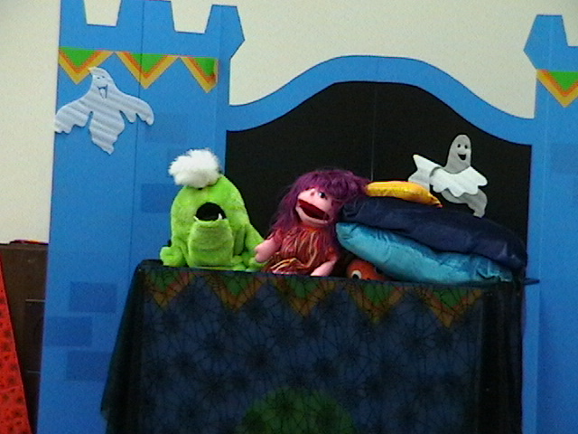 Daisy and Ghoul in the Princess and the Pumpkin, a Halloween version of the Princess and the Pea. I made the top of the head about 3" longer than normal for the Ghoul and brought the fur down straight for about 12" rather than making a separate body for him. [He's like a very large sock puppet] He has a foam inner head--there's no way I could have moved him if he had been stuffed. His arms are about twice as large as normal. The fingers are stuffed, but the arms are floppy. I added a computer duster as his hair to make him appear taller. His eyes are foam golf balls with black buttons glued in place. I was going for "silly" rather than frightening.